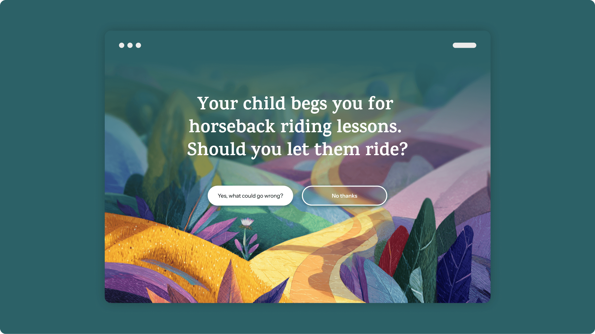 This satirical choose-your-own-adventure game, born from equal parts love and frustration with my own journey in equestrian sports, leans into the uncanniness of AI image generation rather than avoiding it. The experience asks seemingly innocent questions before spiraling into increasingly absurd outcomes that feel painfully relatable to anyone who's spent time in the barn, exploring the chaos and unpredictability of horses through interactive storytelling. I used AI tools like Midjourney, Nano Banana, and Veo to generate a dreamlike, painterly aesthetic that mirrors the tone: whimsical and storybook-like on the surface, but with an off-kilter edge that reinforces satire. The fluid, surreal landscapes and impossible colors create a visual language that feels intentionally exaggerated, turning the experience into a darkly funny reflection on everything that can go wrong when horses are involved.
