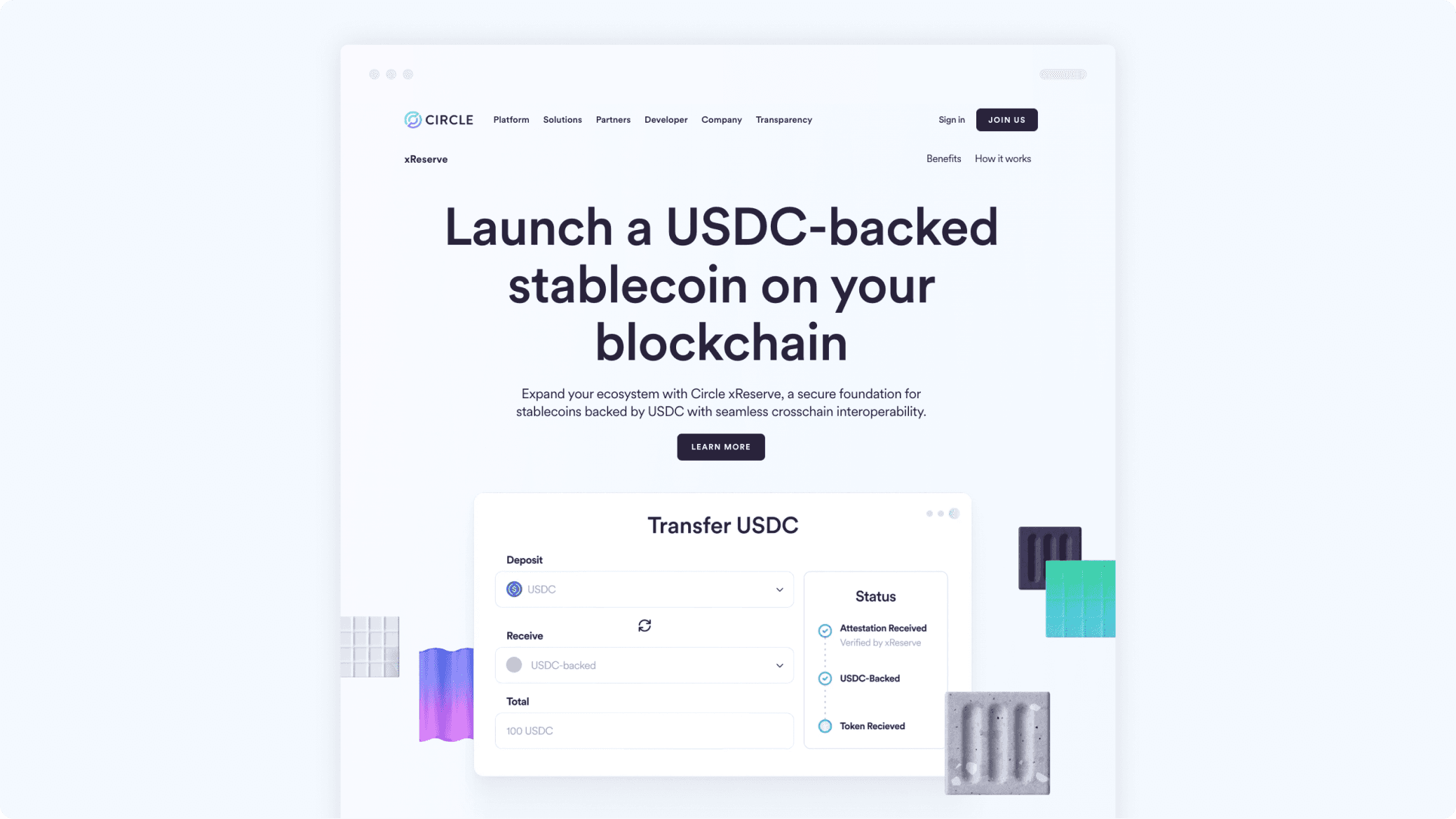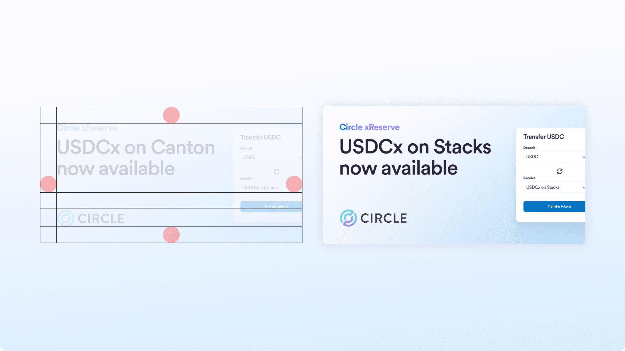 Circle xReserve helps blockchain networks credibly and seamlessly launch their own dollar-backed digital currency. It's essential infrastructure, but the behind-the-scenes nature of the API product presented a core challenge: building a visual system for a product that's invisible by design. I led the visual system for xReserve's go-to-market campaign, developing user interface illustrations at varying fidelities. From hero visuals to inline spots to social graphics, each represented the kinds of digital experiences Circle's customers could create for their users. The result was a cohesive, scalable launch presence across web and social that could evolve with the product as it grew.